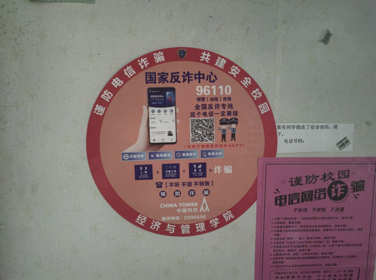近期,校园网络电信诈骗犯罪活动日益猖狂。为提高同学们的防范意识,太阳成集团tyc122ccvip于11月10日进行了防诈骗下寝宣传及贴纸的张贴活动,此活动由各年级辅导员主讲,学为同学们讲解最新诈骗手段及防范方法。