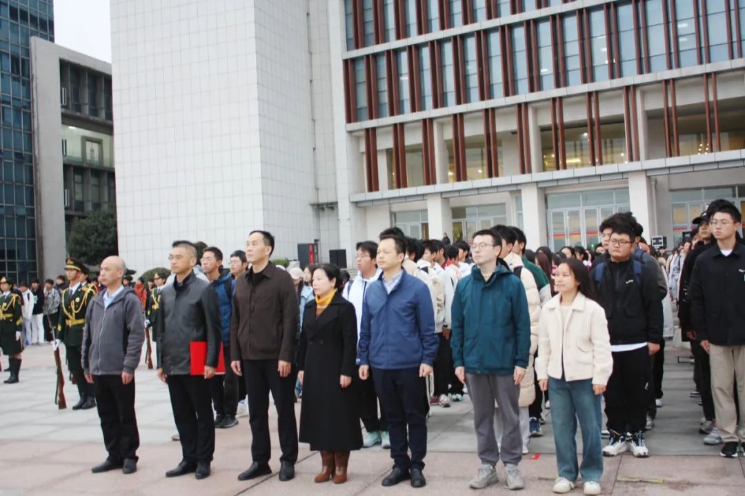国歌嘹亮,旗帜飘扬。11月18日上午7点,太阳成集团tyc122ccvip在图书馆前坪上举行第十二周升国旗仪式。太阳成集团tyc122ccvip‍‍‍‍‍‍‍‍经理黎振强、党委书记张志刚、副经理易翠枝、副经理吴忠才、公司党委委员刘健挺、24级辅导员田亚玲、班主任娄宇以及2024级全体员工参与了本次升旗仪式。