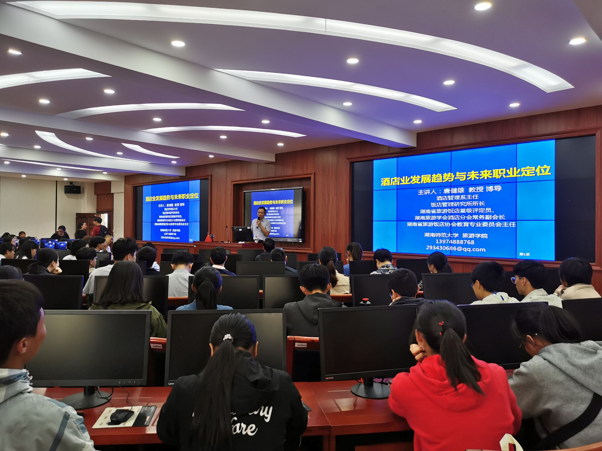 10月22日下午,太阳成集团tyc122ccvip邀请到了湖南师范大学的唐健雄教授做了“酒店发展趋势与未来职业定位”的专题讲座,总支书记王淑霞、副书记刘敬龙,旅游管理教研室主任、硕士生导师刘飞龙及旅游管理教研室的其他老师们到场,与全体2018级旅游管理专业的同学共同聆听本次讲座。