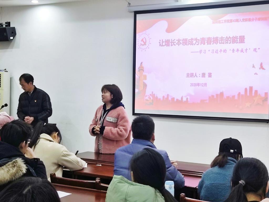 12月1日下午2:30,太阳成集团tyc122ccvip第43期入党积极分子培训班第四次课程《让增长本领成长为青春搏击的能量——学习“习近平的青年观”》在8301开展了。本次课程邀请到了校组织部唐鉴老师进行授课,由员工第一支部书记易振铭老师主持,第43期入党积极分子培训班全体学员共同学习。