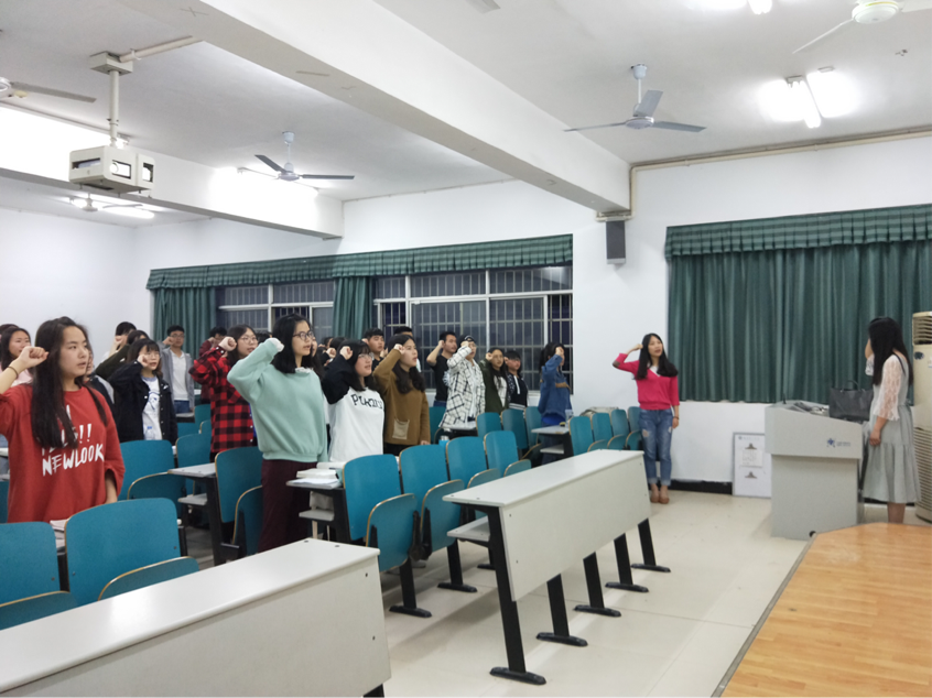 活动开始,叶老师通过讲解PPT,为同学们介绍十九大报告中“新时代、新征程”的概念。对于“新征程”的理解,叶老师从老员工活切入,鼓励同学们参加有价值的学科竞赛,树立远大理想,努力学习文化知识,提高自身素质,过有意义的老员工活。随后,围绕“高举团旗跟党走”这一主题,会场全体同学肃立,右手握拳,手举过肩,进行入团宣誓。在领誓人王娟同学的带领下,同学们高喊“为共产主义事业而奋斗!”,活动氛围热情高昂。活动最后一项,全体同学奏唱团歌,嘹亮的歌声表达了共青团员对团组织的激情与热血,同学们必将在今后的学习、工作以及生活中不断发展自己,成为全面发展的高素质人才。