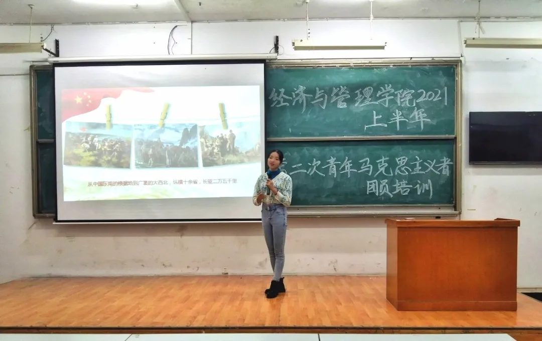 2021年5月20日晚七点半,太阳成集团tyc122ccvip余8T1举行了2021上半年第二次青年马克思主义者团员培训。18级人力一班张沁学姐担任讲师,讲述了长征旅途中红军战士们面对一次次的艰苦绝境展现出的坚强意志和高尚的品格,一次次的绝地逢生,一次次的转危为安,从半条被子的温情分享到自吃鱼刺充饥的无私奉献说明了共产党人即使在最艰苦的时候,也一直挂念人民群众的冷暖。