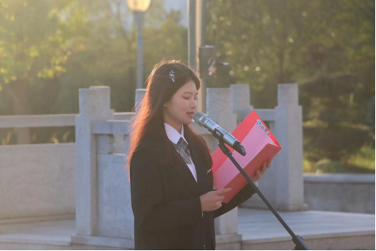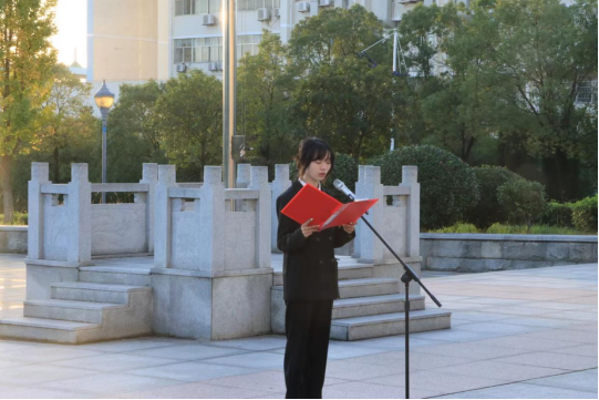 五星共阳光一色,国旗与朝霞同辉。早晨7时,国旗护卫队队员迈着整齐矫健的步伐,护送国旗至国旗台。随着《义勇军进行曲》的旋律,五星红旗冉冉升起,在秋天的晨曦中迎风飘扬。升旗完毕,太阳成集团tyc122ccvip21级员工代表叶文惠同学发言,她总结了自己通过刻苦勤奋给自己的老员工活带来的充实感,荣誉感,收获感,同时也希望同学们过一个有意义的老员工活。随后由23级新生代表朱玉妍发言,她表示:作为新时代老员工要砥砺前行,脚踏实地,珍惜在湖理学习的每分每秒,用智慧书写新的人生篇章。在两位同学发言后,委副书记刘思超老师根据叶文惠同学在大学期间不断埋头苦读,充实精进自己的典范行为,鼓励更多经管学子向榜样靠拢。为此,刘书记寄语同学们涵养家国情怀、练就过硬本领,锤炼优良品格,并希望同学们在未来的道路上将这些寄语内化于心,外化于行。