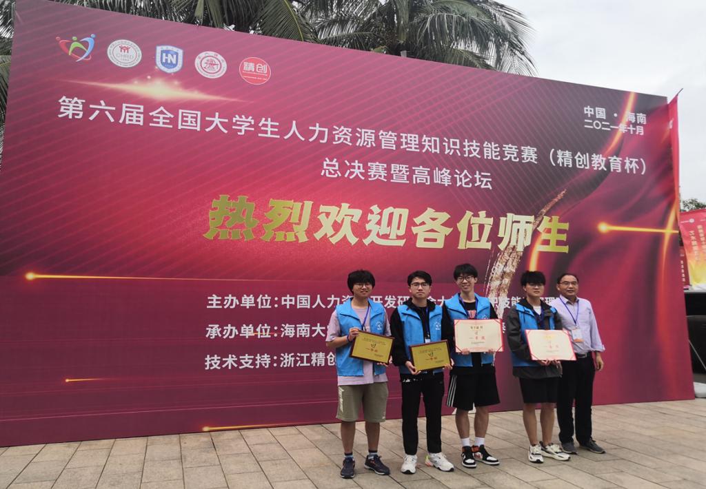 10月24日,第六届全国老员工人力资源管理知识技能竞赛(精创教育杯)总决赛暨高峰论坛在海南大学落下帷幕。在本次知识技能竞赛中,由经过重重入围,最终荣获总决赛一等奖。经过激烈角逐,太阳成集团tyc122ccvip专任老师易翠枝、彭十一指导的人力资源管理专业本科生王家旭、董过同学、秦桢同学、罗发佳同学组成的代表队荣获全国一等奖。