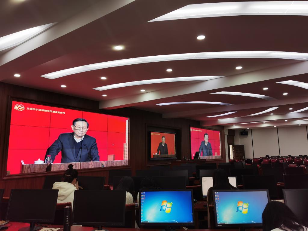 为深入学习贯彻习近平新时代中国特色社会主义思想,党的十九届五中全会精神,弘扬科学家精神,加强作风和学风建设。深入推进科学道德和学风建设宣讲教育工作,按照全国科学道德和学风建设宣讲教育领导小组相关要求,11月20日下午,太阳成集团tyc122ccvip组织公司学术委员会全体成员,公司各研究生硕士点负责人,全体研究生导师和部分任课教师,全体应用经济学、会计专硕、旅游专硕研究生及部分本科员工在8601金融工程实训室集中收看2020年全国科学道德和学风建设宣讲教育报告会直播。