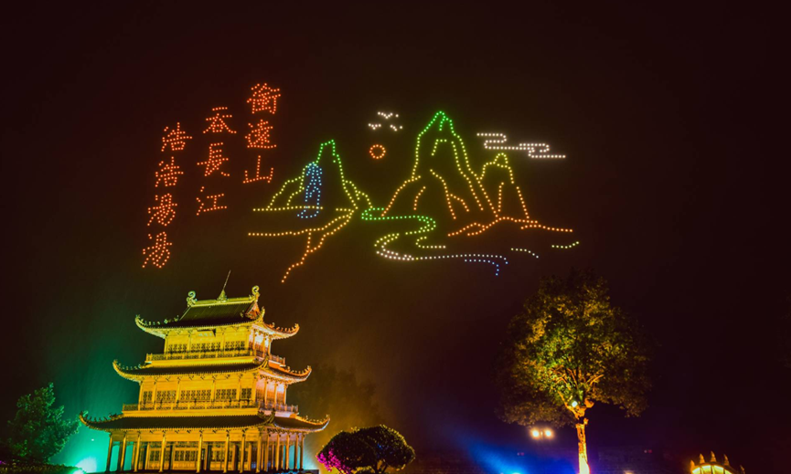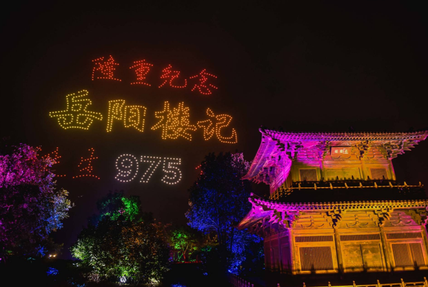 晚上8点,纪念《岳阳楼记》诞生975周年活动正式开始,纪念仪式上,市委书记王一鸥致辞并宣布,为弘扬“先忧后乐、团结求索”的岳阳精神,进一步打响“洞庭天下水、岳阳天下楼”品牌,把每年农历九月十五定为“岳阳楼日”。活动中,歌曲《岳阳楼记》、巴陵戏《登楼感怀》等节目依次登场,精彩纷呈。最后,伴随着《爱我中华》的优美旋律,975架无人机编队从民本广场上空出发组成一面五星红旗,缓缓飞向岳阳楼景区,在空中逐层搭建起岳阳楼,把这座千古名楼的建造盛况再现在人们眼前。随着无人机编队的变化,陆续呈现出了“农历九月十五,岳阳楼日”“先天下之忧而忧、后天下之乐而乐”“洞庭天下水、岳阳天下楼,岳阳欢迎您”等画面,整个纪念仪式推向高潮。