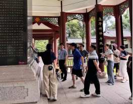 调研首站,师生们怀着崇高的敬意步入屈子祠主殿。在专业讲解员的引导下,大家细致观摩了祠内陈列的《离骚》、《九歌》等楚辞经典篇章的历代刻本与相关文物,深刻感悟屈原“长太息以掩涕兮,哀民生之多艰”的民本思想、“亦余心之所善兮,虽九死其犹未悔”的坚定信念以及“路漫漫其修远兮,吾将上下而求索”的执着探索精神。 这堂生动的爱国主义教育课让大家深受触动。随后,师生们移步至碑林长廊、独醒亭与九歌广场等富含楚文化意蕴的景点,实地感受楚辞意境,并重点就如何挖掘屈原精神的时代价值,将其转化为优质的研学旅行内容和红色旅游产品进行了现场观察与思考。